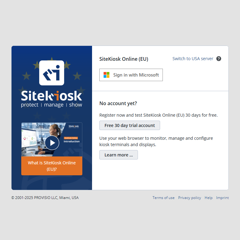 Todos los datos generados durante el uso de SiteKiosk Online se almacenan en un servidor externo compatible con GDPR del proveedor de servicios PlusServer GmbH.