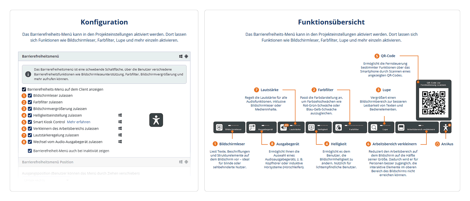 Mit der Version 1.8 von SiteKiosk Online wurde ein umfassendes Barrierefreiheits-Template eingeführt, das Anwendern einen vollständigen Überblick über alle verfügbaren Accessibility-Funktionen bietet.
