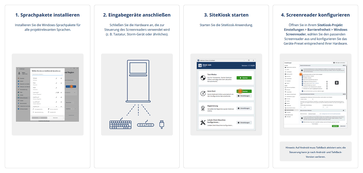 • Für Windows kann neben dem integrierten SiteKiosk Reader auch ein externer Screenreader wie NVDA, JAWS oder der Windows Narrator verwendet werden.